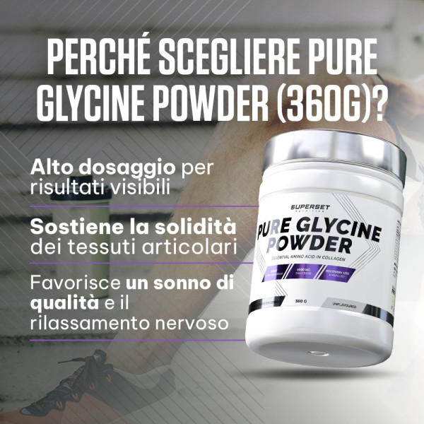 Sviluppato dal marchio francese Superset Nutrition, Pure Glycine Powder (360g) presenta una formula al 100% di glicina, senza aromi, additivi o zuccheri. Naturale, essenziale ed efficace, la glicina agisce sui muscoli, sulle articolazioni e sul recupero generale: