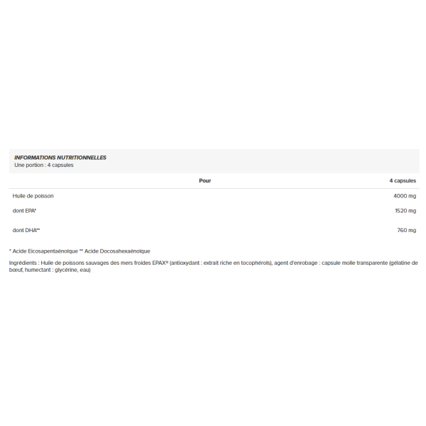 Ingredienti: olio di pesce selvatico di mare freddo EPAX® (antiossidante: estratto ricco di tocoferoli), agente di rivestimento: softgel trasparente (gelatina di manzo, umettante: glicerina, acqua)