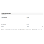 Ingredienti: Idrolizzato di collagene bovino Peptan® (peptidi di collagene di tipo I), idrolizzato di cartilagine bovina Colartix® (peptidi di collagene di tipo I, II e III, condroitina solfato), N-acetilglucosamina naturale (crostacei), condroitina solfato, acido L-ascorbico Quali®-C (vitamina C)