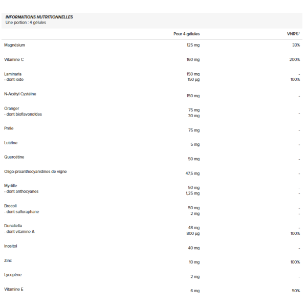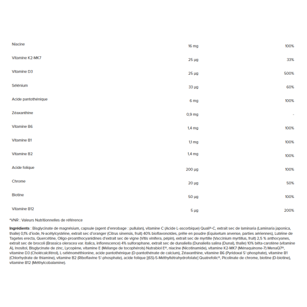 Ingredienti : Capsula vegetale (agente di rivestimento : ipromellosa), fibra di acacia (Acacia senegal), magnesio bisglicinato Albion® Minerals, L-alfa-glicerofosforilcolina (colina), acido L-ascorbico Quali®-C (vitamina C), N-acetilcisteina (NAC), inositolo esaniacinato, acido alfa-lipoico, zinco bisglicinato Albion® Minerals, estratto di sophora giapponese (Sophora japonica, quercetina), estratto di camomilla (Matricaria chamomilla, luteolina e apigenina), ubichinone (CoQ10), oleoresina ricca di astaxantina estratta dall'alga Haematococcus pluvialis, nicotinamide riboside (vitamina B3), estratto di calendula (Tagetes erecta, luteina), D-alfa-tocoferolo Nutrabiol E® (vitamina E), D-pantetina (vitamina B5), menachinone-7 MenaQ7® (vitamina K2), piridossale-5-fosfato (vitamina B6), benfotiamina (vitamina B1), riboflavina Quali-B® (vitamina B2), beta-carotene Quali®-Carotene (vitamina A), Quatrefolic® calcio L-metilfolato (vitamina B9), molibdato di sodio (molibdeno), cromo picolinato, ioduro di potassio (iodio), D-biotina (vitamina B8), L-selenometionina (selenio), colecalciferolo (vitamina D), metilcobalamina (vitamina B12).