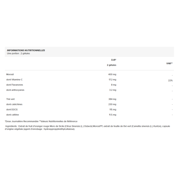Ingredienti: Morosil™ estratto di frutti di arancia rossa di Sicilia (Citrus Sinensis (L.) Osbeck), estratto di foglie di tè verde (Camellia sinensis (L.) Kuntze), capsula vegetale (agente di rivestimento: idrossipropilmetilcellulosa).