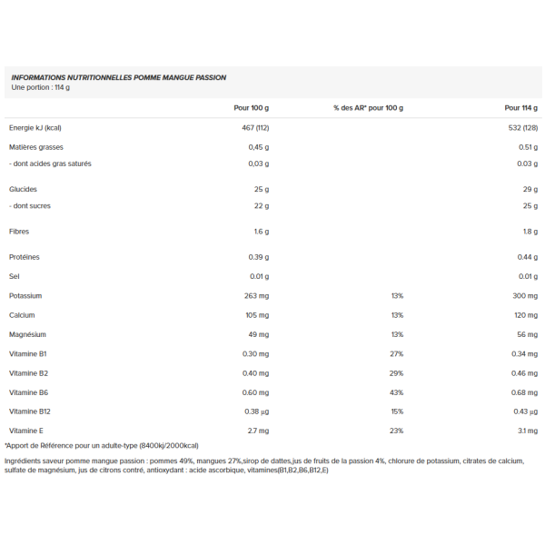Ingredienti - mela mango gusto passione mela 49%, mango 27%, sciroppo di datteri, succo di frutto della passione 4%, cloruro di potassio, citrato di calcio, solfato di magnesio, succo di limone, antiossidante: acido ascorbico, vitamine (B1,B2,B6,B12,E)