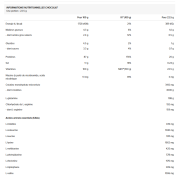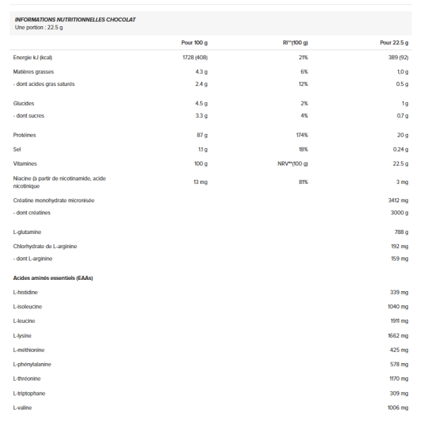 Ingredienti del cioccolato: proteine isolate da siero di latte isolato proteico istantaneo siero di latte, emulsionante [lecitine (soia)]} 35%, concentrato proteico di siero di latte concentrato istantaneo di proteine siero di latte, emulsionante (lecitine (soia)]} 34%, creatina monoidrato micronizzata 15%, cacao magro in polvere, L-glutammina 3,5%, aromi, miscela di panna [grasso di cocco totalmente idrogenato, latte polvere, emulsionanti (E471, E472a), sciroppo di glucosio, saccarosio, proteine del latte, proteine del latte, proteine del latte latte, stabilizzante (fosfati di potassio)], emulsionante [lecitine (soia)], addensanti (carragenina, gomma di xanthan), L-arginina cloridrato 0,85%, sale, antiagglomerante (biossido di silicio), edulcorante (sucralosio), niacina (nicotinamide, acido nicotinico).