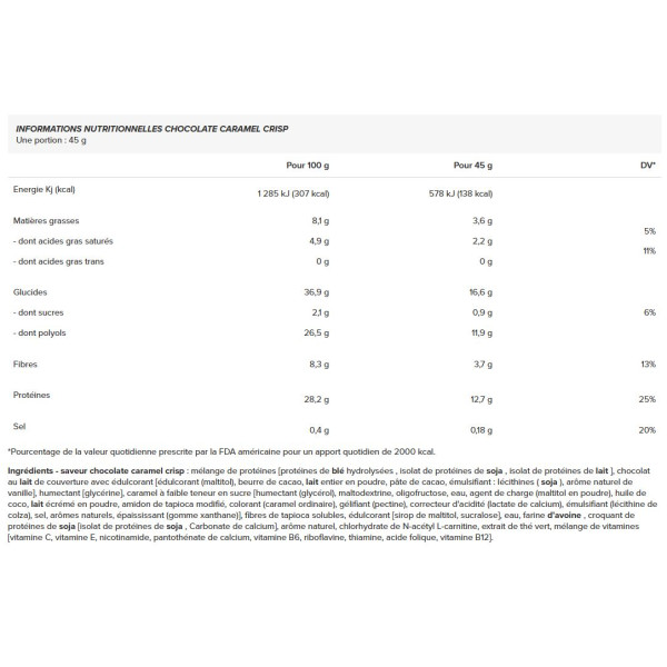 Ingredienti - gusto cioccolato caramello croccante: miscela di proteine [proteine idrolizzate del grano, proteine isolate della soia, proteine isolate del latte ], cioccolato al latte con edulcorante [edulcorante (maltitolo), burro di cacao, latte intero in polvere, pasta di cacao, emulsionante : lecitine (soia ), aroma naturale di vaniglia], umidificante [glycérine], caramello a basso contenuto di zucchero [umidificante (glicerolo), maltodestrina, oligofruttosio, acqua, agente di carica (maltitolo in polvere), olio di cocco, latte scremato in polvere, amido di tapioca modificato, colore (caramello semplice), agente gelificante (pectina), regolatore di acidità (lattato di calcio), emulsionante (lecitina di colza), sale, aromi naturali, addensante (gomma di xantano)], fibra solubile di tapioca, edulcorante [sirop de maltitol, sucralose], acqua, farina di avena, croccante di proteine di soia [ isolato di proteine di soia, carbonato di calcio], aroma naturale, N-acetil L-carnitina cloridrato, estratto di tè verde, miscela vitaminica [vitamine C, vitamine E, nicotinamide, pantothénate de calcium, vitamine B6, riboflavine, thiamine, acide folique, vitamine B12].