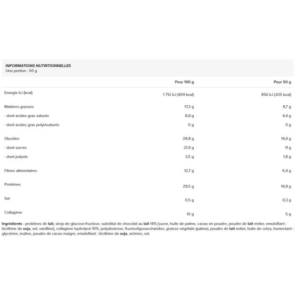 Ingredienti: proteine del latte, sciroppo di glucosio-fruttosio, sostituto del cioccolato al latte 14% [zucchero, olio di palma, cacao in polvere, latte intero in polvere, emulsionante : lecitina di soia, sale, vanillina], collagene idrolizzato 10%, polidestrosio, fruttoligosaccaridi, grasso vegetale (palma), latte intero in polvere, olio di colza, umidificante: glicerina, inulina, cacao magro in polvere, emulsionante: lecitina di soia, aromi, sale.