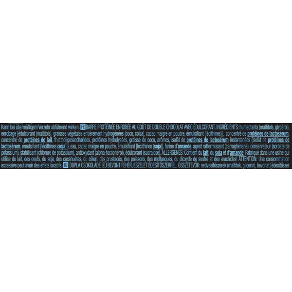 Ingredienti del doppio cioccolato : [édulcorant (maltitols), graisses végétales entièrement hydrogénées (coco, colza), poudre de cacao dégraissée, émulsifiant (lécithines)] umettanti (maltitoli, glicerolo), copertura, concentrato di proteine del siero di latte, concentrato di proteine del latte, fruttoligosaccaridi, proteine idrolizzate, grasso di cocco, aromi, proteine istantanee del siero di latte isolate {proteine del siero di latte isolate, emulsionante [lecitine(soia)]}, acqua, cacao sgrassato in polvere, emulsionante [lecitine(soia)], farina di mandorle, agente rassodante (carragenina), conservante (sorbato di potassio), stabilizzante (cloruro di potassio), antiossidante (alfa-tocoferolo), edulcorante (sucralosio).