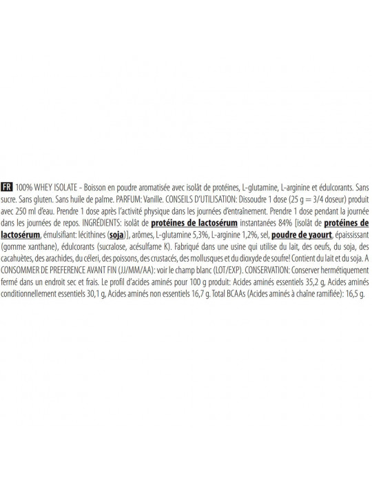 Ingredienti Vaniglia :Proteine isolate dasiero di latteIstantaneo 84% [proteine isolate del lattesiero di latte, emulsionante: lecitine (soia)], aromi, L-glutammina 5,3%, L-arginina 1,2%, sale, polvere diyogurt, addensante (gomma di xanthan), edulcoranti (sucralosio, acesulfame K).