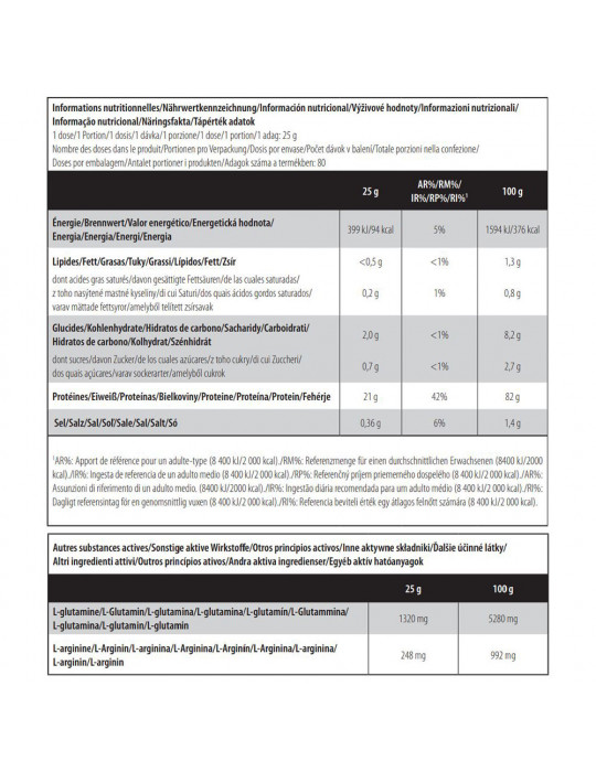 | Amminoacidi essenziali condizionati L-Arginina L-cisteina L-Glutammina L-Prolina L-tirosina | 30.1g 2.9g 2.4g 18.4g 4.2g 2.2g | |