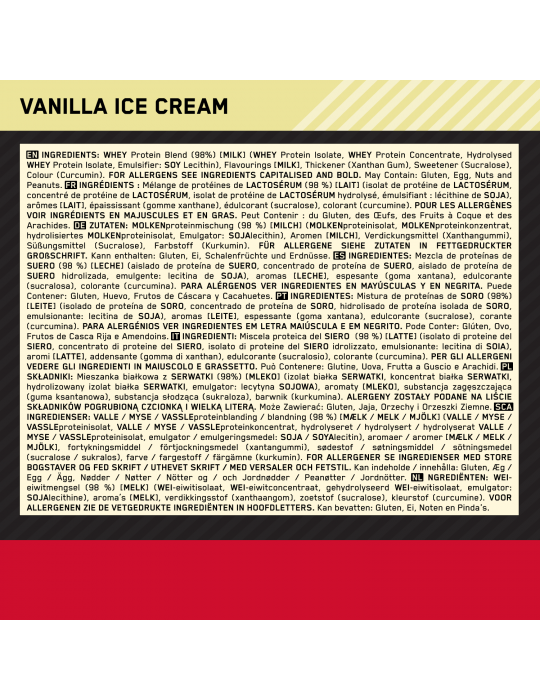 Ingredienti Vaniglia :Miscela di proteine di LATTOSERIO (98%) [LATTE] (proteine isolate da LATTOSERIO, concentrato di proteine LATTOSERIO, proteine isolate LATTOSERIO idrolizzato, emulsionante: lecitina da SOJA), aromi, cloruro di sodio, addensante (gomma di xanthan), edulcorante (sucralosio), colorante (curcumina).