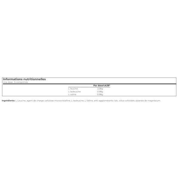 Ingrediënten: L-Leucine, vulstof: microkristallijne cellulose, L-Isoleucine, L-Valine, antiklontermiddelen: talk, colloïdaal siliciumdioxide, magnesiumstearaat.