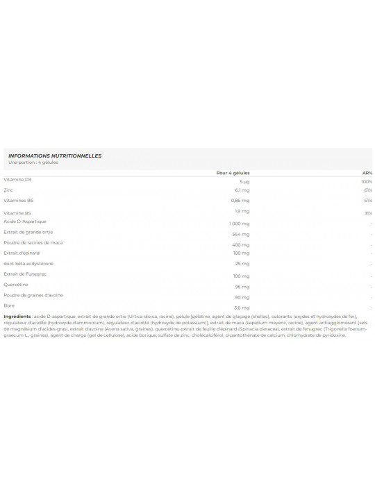 D-asparaginezuur staat bekend om zijn vermogen om het totale testosteron te verhogen, terwijl brandnetelextract de binding van SHBG-eiwit aan vrij testosteron remt. Fenegriek, rijk aan saponinen, is sinds 1905 opgenomen in het farmaceutisch wetboek als een stimulans van de anabole functies van het lichaam. Het versterkt deanabole werking van deze complete hormoonstimulerende formule.