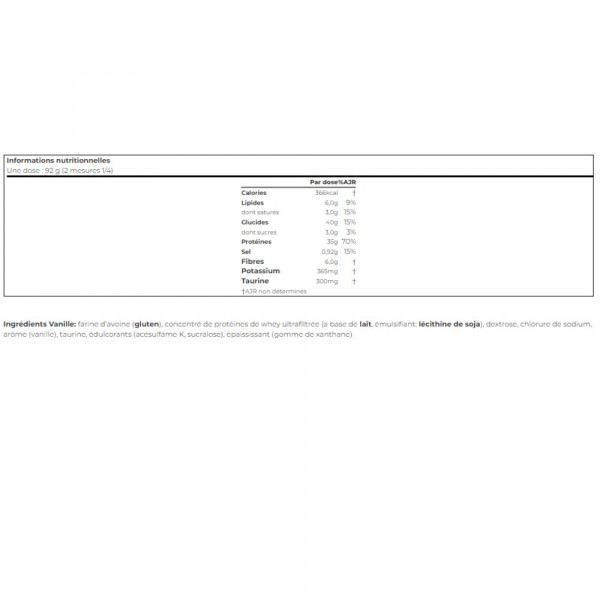 Dit havermout-eiwitpoeder is een bron van hoogwaardige eiwitten (ultragefilterde wei) en koolhydraten (havermout) met een langzame spijsvertering en een lage glykemische index. Dit voedingssupplement is ook zeer rijk aan vezels en voldoet aan je voedingsbehoeften. Havermoutpoeder voor bodybuilding is ook erg interessant .