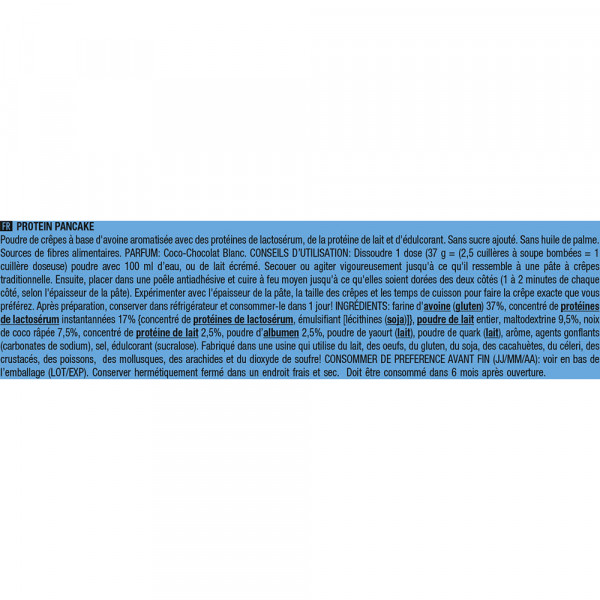 Ingrediënten Witte chocolade - kokos : havermeel (gluten), instant wei-eiwit (melk), wei-eiwitconcentraat(melk), emulgator: lecithine (soja), volle melkpoeder, maltodextrine, kokosstukjes, melkeiwitconcentraat, eiwit uit eiwit van eieren, yoghurtpoeder, kwarkpoeder, aroma, vulstof, zout, zoetstof (sucralose).