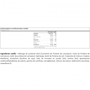 Vanille-ingrediënten:Eiwitmengsel (melk) (GeconcentreerdWei, eiwitisolaatWei, eiwitisolaatWeiEiwitisolaat, gehydrolyseerdMelk, CaseïnaatVan calcium,CaseïneMicellair), emulgator (lecithine vanSoja), zonnebloemoliepoeder (melk), aroma's (melk), verdikkingsmiddelen (natriumcarbomethylcellulose, xanthaangom, carrageen), natriumchloride, zoetstoffen (sucralose, acesulfaam K).