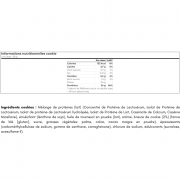 Ingrediënten voor chocolade:Eiwitmengsel (melk) (Geconcentreerd Wei, eiwitisolaat Wei, eiwitisolaat Wei eiwitisolaat, gehydrolyseerd Melk, , Caseïnaat van calcium, Caseïne Micellair), emulgator (lecithine van soja), zonnebloemoliepoeder (melk), aroma's (melk), magere cacaopoeder (7%), verdikkingsmiddelen (natriumcarbomethylcellulose, xanthaangom, carrageen), natriumchloride, natuurlijke kleurstoffen, zoetstoffen (sucralose, acesulfaam K).