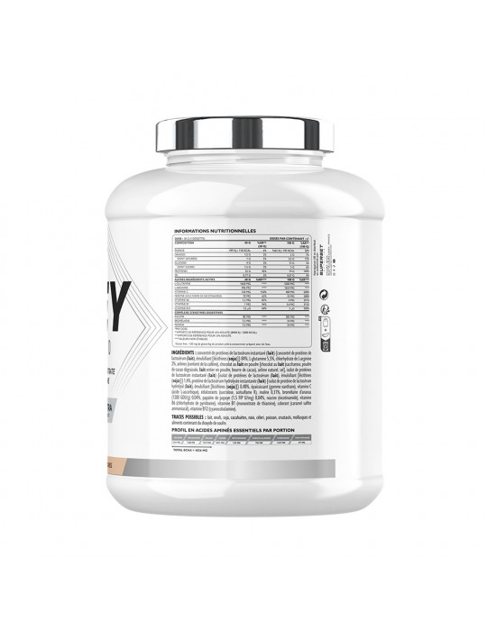 Ingrediënten KokosnootInstant wei-eiwitconcentraat (melk) {eiwitconcentraat (melk), emulgator [lecithinen (soja)]} 77%, ontvette cacaopoeder 9%, L-glutamine 5,5%, aroma's (bevat cafeïne), L-arginine hydrochloride 2%, instant wei-eiwitisolaat (melk) {wei-eiwitisolaat (melk), emulgator [lecithinen (soja)]} 1,4%, instant gehydrolyseerd wei-eiwit (melk) {gehydrolyseerd wei-eiwitisolaat (melk), emulgator [lecithinen (soja)]} 0,48%, verdikkingsmiddel (xanthaangom), vitamine C (L-ascorbinezuur), zoetstoffen (sucralose, acesulfaam K), inuline 0,31%, melkchocoladepoeder [chocolat au lait (saccharose, cacao dégraissé en poudre, lait entier en poudre, beurre de cacao), arôme naturel, sel] 0,2%, ananasbromelaïne (1200 GDU/g) 0,04%, papaja papaïne (1,5 FIP U/ mg) 0,04%, niacine (nicotinamide), vitamine B6 (pyridoxine hydrochloride), vitamine B1 (thiaminemononitraat), vitamine B12 (cyanocobalamine).