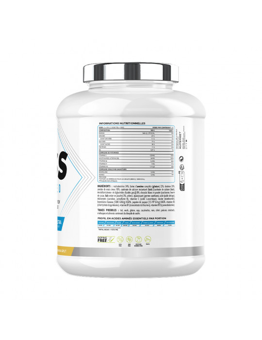 Ingrediënten Vanille : maltodextrine 34%, tarwebloemhaver volledig (gluten) 24%, dextrose 20%, wasachtig maïszetmeel 10%, instant calciumcaseïnaat (melk) [calciumcaseïnaat (melk), emulgator (mono- en diglyceriden van vetzuren)] 8%, aroma's, yoghurtpoeder (melk), verdikkingsmiddel (xanthaangom), zoetstoffen (sucralose, acesulfaam K), vitamine C (L-ascorbinezuur), niacine (nicotinamide), ananasbromelaïne (1200 GDU/g) 0,02%, papaja papaïne (1,5 FIP U/mg) 0,02%, vitamine B6 (pyridoxine hydrochloride), vitamine B1 (thiaminemononitraat), vitamine B12 (cyanocobalamine).