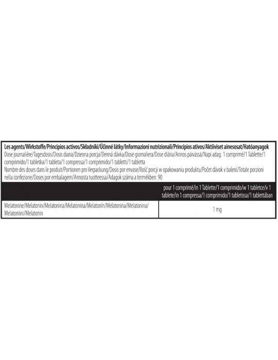 Ingrediënten: vulstoffen (calciumfosfaten, cellulosegel, Dosium cross-linked carboxymethylcellulose), melatonine 0,5%, antiklontermiddel (magnesiumzouten van vetzuren).