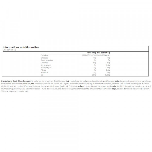 Ingredienten Donkere Choc Framboos: Eiwitmengsel [Melkeiwit, Collageenhydrolysaat, Soja-eiwitisolaat], Karamelcoating met frambozensmaak [Zoetstof (Maltitol), Geconcentreerde melk, Cacaoboter, Water, Zuurmiddel (Citroenzuur), Bevochtigingsmiddel (Sorbitol), Emulgator (Mono- en Diglyceriden van vetzuren), Aroma's, Zout, kleurstof (karmijn)], cacaomassa, zoetstof (maltitol), gepofte soja [soja-eiwitisolaat, tapiocazetmeel, cacaopoeder], bevochtigingsmiddel (glycerol), water, cacaoboter, kokosolie, magere cacaopoeder, aroma's, emulgator (sojalecithine), natuurlijk Bourbon vanille aroma. Omhuld met 31% pure chocolade.