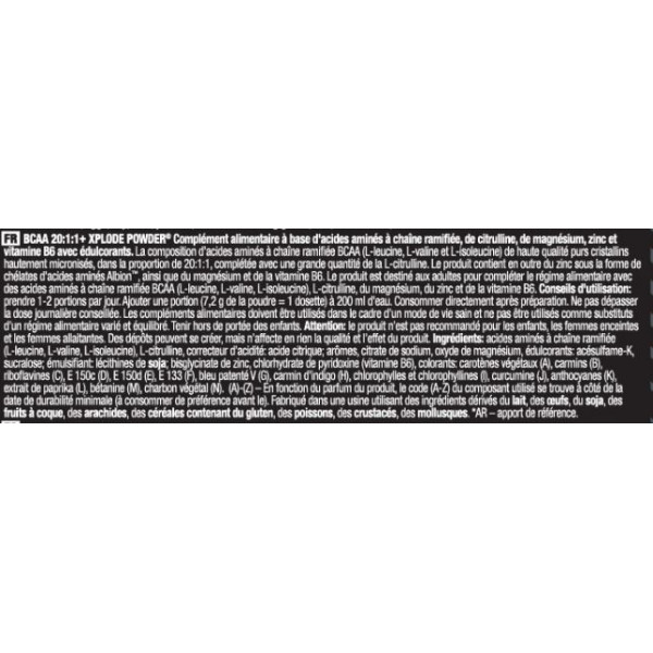 BCAA Xplode Powder 20;1;1 is een product dat BCAA-aminozuren bevat :- L-leucine, L-valine en L-isoleucine. Met 5000 mg BCAA-aminozuren met vertakte keten, die essentiële aminozuren zijn en meer dan 30% van de spieren uitmaken, is de formule ook verrijkt met 1000 mg L-citrulline, mineralen en vitamine B6.
