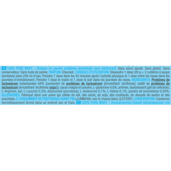 Ingrediënten - ChocoladesmaakEiwittenweiInstant 84% {eiwitconcentraat vanwei [émulsifiant : lécithines], eiwitisolaatwei[emulgator: lecithinen (soja)]}, magere cacaopoeder, L-glutamine 4,6%, aroma's, verdikkingsmiddel (cellulosegel), L-Arginine, zout, L-Leucine 0,2%, zoetstof (sucralose), L-Isoleucine 0,1%, L-Valine 0,1%, bromelaïnepoeder 0,04