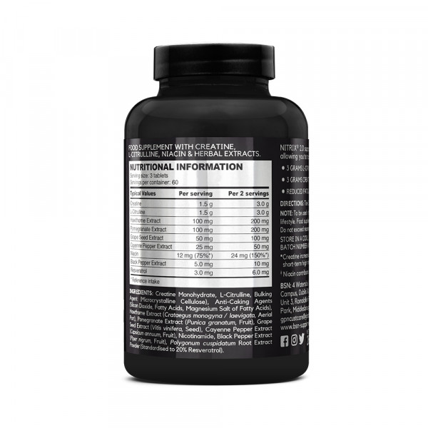 Ingrediënten: Creatinemonohydraat, L-citrulline, vulstof (microkristallijne cellulose), antiklontermiddel (siliciumdioxide, magnesiumzouten van vetzuren), meidoornextract(Crataegus monogyna/laevigata, bovengrondse deel), granaatappelextract(Punica granatum, vrucht), druivenpitextract(Vitis vinifera, zaad), Cayennepepepepepepepeerextract(Capsicum annuum, vrucht), Polygonum cuspidatum-wortelextract poeder (extract gestandaardiseerd tot 20% resveratrol), nicotinamide, zwartepepepepepepeerextract(Piper nigrum, vrucht).