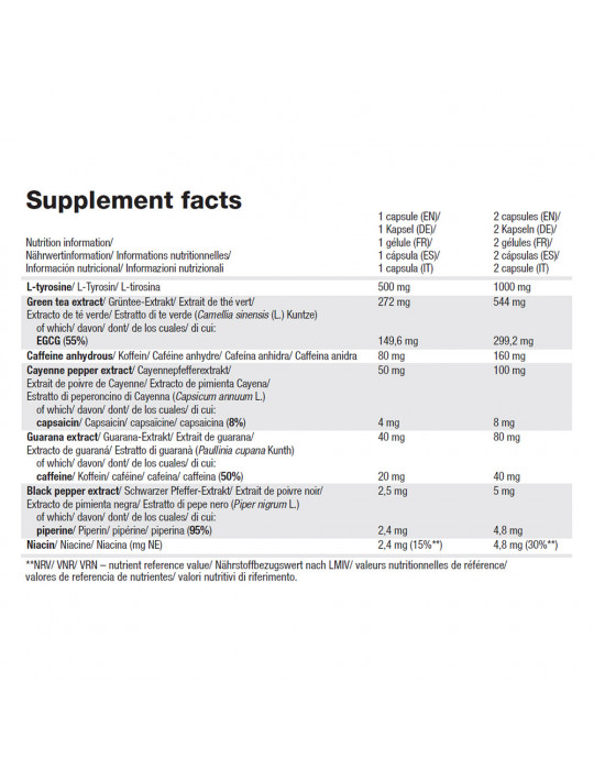 Ingrediënten: 42,2% L-tyrosine, 23% groene thee extract(Camellia Sinensis (L.) Kuntze), 6,7% cafeïne watervrij, vulstof - microkristallijne cellulose; 4,2% cayennepeper vrucht extract(Capsicum Annuum L.), 3,4% guaranazaadextract(Paullina Cupana Kunth.), antiklontermiddel - magnesiumzouten van vetzuren, siliciumdioxine; 0,2% extract van zwarte peper(Piper Nigrum L.), 0,2% nicotinezuur - niacine, capsule (gelatine, kleurstof: E171).