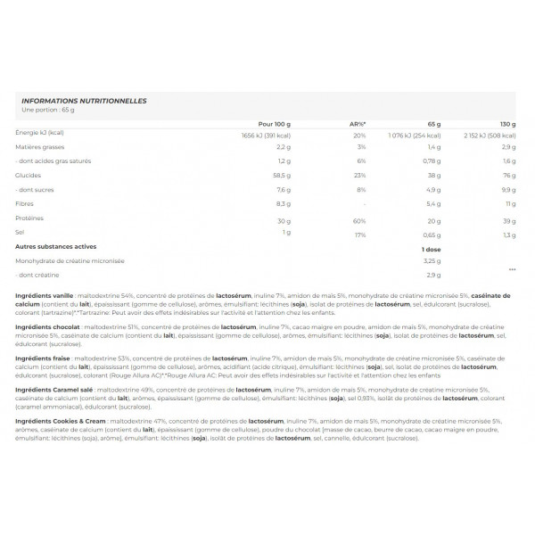 Vanille-ingrediënten: maltodextrine 54%, wei-eiwitconcentraat, inuline 7%, maïszetmeel 5%, gemicroniseerd creatinemonohydraat 5%, calciumcaseïnaat (bevat melk), verdikkingsmiddel (cellulosegom), aroma's, emulgator: lecithine(soja), wei-eiwitisolaat, zout, zoetstof (sucralose), kleurstof (tartrazine)*.*Tartrazine: Kan negatieve effecten hebben op activiteit en aandacht bij kinderen.