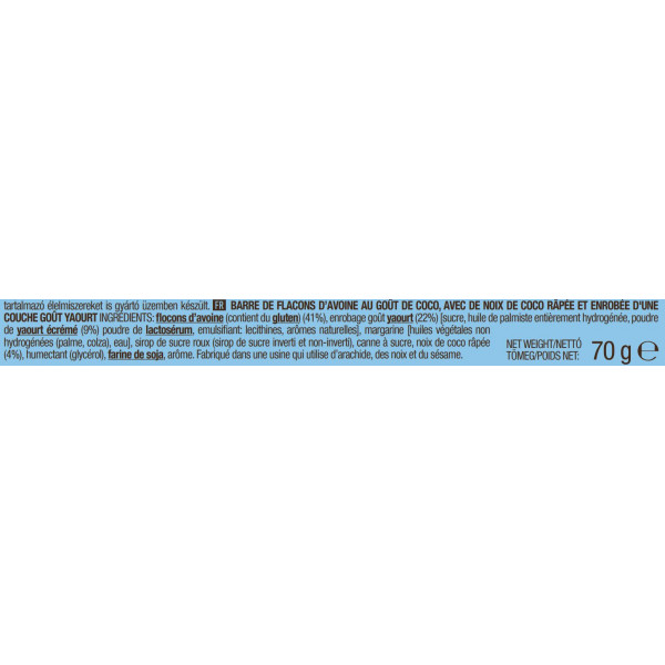 Kokosgeur ingrediënten : havervlokken (bevat gluten) (41%), smaakcoating yoghurt (22%) [suiker, volledig gehydrogeneerde palmpitolie, palmpitpoeder magere yoghurt (9%), poeder wei, emulgator: lecithine, natuurlijke aroma's], margarine [huiles végétales non hydrogénées (palme, colza), eau], bruine suikersiroop (invertsuikerstroop en niet-invertsuikerstroop), rietsuiker, geraspte kokos (4%), bevochtigingsmiddel (glycerol), tarwebloem (5%) soja, aroma.