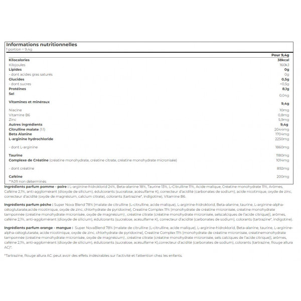 Ingredienten sinaasappel - mango geur : L-arginine-hidrokloride 24%, Beta-alanine 18%, Taurine 13%, L-Citrulline 11%, Appelzuur, Creatinemonohydraat 11%, Smaakstoffen, Cafeïne 2,1%, antiklontermiddel (siliciumdioxide), zoetstoffen (sucralose, acesulfaam K), zuurteregelaar (natriumcarbonaat), nicotinezuur, zinkoxide, zuurteregelaar (magnesiumoxide, calciumcitraat), kleurstoffen (tartrazine*, Aluura Red AC), vitamine B6 (py-ridoxinehydrochloride).