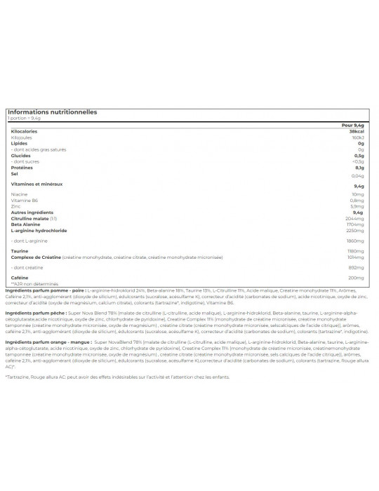 Ingredienten appel-perzik smaak : L-arginine-hidrokloride 24%, Beta-alanine 18%, Taurine 13%, L-Citrulline 11%, Appelzuur, Creatinemonohydraat 11%, Smaakstoffen, Cafeïne 2,1%, antiklontermiddel (siliciumdioxide), zoetstoffen (sucralose, acesulfaam K), zuurteregelaar (natriumcarbonaat), nicotinezuur, zinkoxide, zuurteregelaar (magnesiumoxide, calciumcitraat), kleurstoffen (tartrazine*, indigotine), vitamine B6 (py-ridoxinehydrochloride).