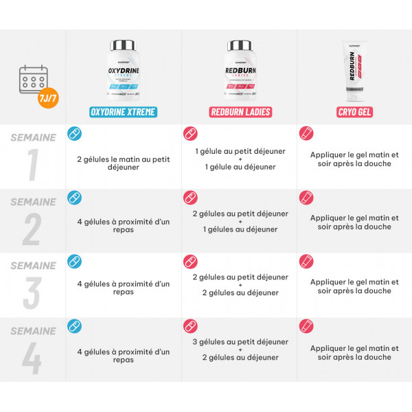 Ingrediënten : extractvan groene theebladeren(Camellia sinensis) 23%, extract van paardenbloemwortel(Taraxacum officinale) 15%, capsulehuls (gelatine), verdikkingsmiddel (kaliumchloride), CLA-poeder [glyceriden (rijk aan CLA), maïssiroop, natriumcaseïnaat(melk), antiklontermiddel (siliciumdioxide), stabilisator (kaliumfosfaten)] 13%, forskholine-wortelextract(Coleus forskohlii) 8,6%, L-tryptofaan 4,8%, L-tyrosine 4,8%, antiklontermiddel (magnesiumzouten van vetzuren), Japanse duizendknoop-wortelextract(Polygonum cuspidatum) 0,41%, riboflavine, chroom(III)chloride.