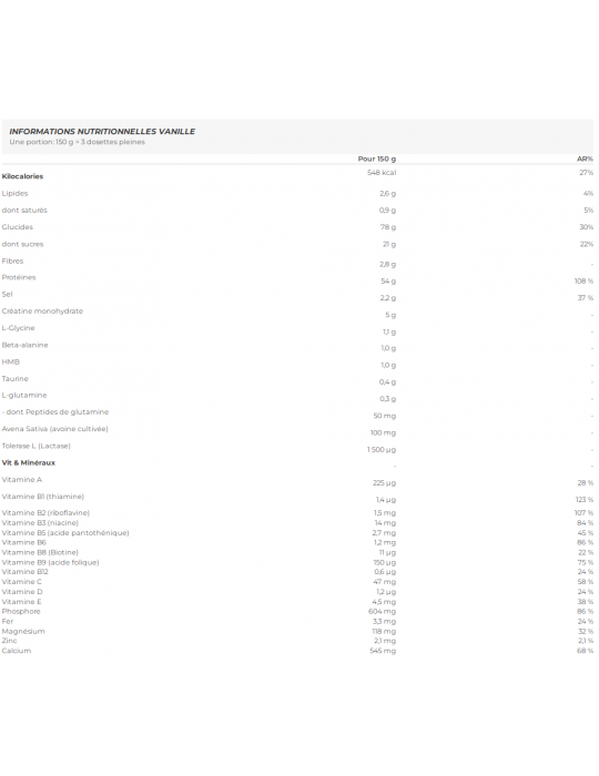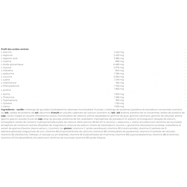 Ingrediënten - Aardbeiensmaak :koolhydraatmengsel: [maltodextrine, dextrose monohydraté, fructose], eiwitmengsel [geconcentreerd wei-eiwit (bevat melk), eiwitisolaat van melk, albumine van eieren poeder, calciumcaseïnaat (bevat melk), magere melk, geconcentreerd rijsteiwit, eiwitisolaat van sojaCreatinemonohydraat; aroma; verdikkingsmiddelen: guarpitmeel, xanthaangom, cellulosegom; tapiocazetmeel; glycine; vetpoeder (kokosolie, maïsolie, enz.) soja, glucosestroop melk, stabilisator: kaliumnatriumtrifosfaat, antistollingsmiddel: siliciumdioxide, antioxidant: rozemarijnextract); calciumhydroxymethylbutyraat; bèta-alanine; BCAA 2:1:1 (L-leucine, L-isoleucine, L-valine, emulgator: zonnebloemlecithine); tricalciumfosfaat; magnesiumlactaatdihydraat; kleurstof: bietenrood (Beta vulgaris); natriumchloride; tripotassiumcitraat; taurine; L-glutamine; natuurlijk aroma; zoetstoffen: sucralose, acesulfaam-K; haverzaadextract (Avena sativa L.) (bevat gluten); vitamine C (ascorbinezuur); vitamine B3 (nicotinamide); vitamine E (D-alfa-tocoferylacetaat); zinkbisglycinaat; vitamine B5 (calcium-D-pantothenaat); vitamine B6 (pyridoxinehydrochloride); vitamine A (retinylacetaat); vitamine B2 (riboflavine); Tolerase L® (pH-gestabiliseerd lactase); vitamine B1 (thiamine hydrochloraat); vitamine B12 (cyanocobalamine); vitamine B8 (D-biotine); vitamine D3 (cholecalciferol); emulgator : zonnebloemlecithine; vitamine B9 (foliumzuur), antistollingsmiddel: siliciumdioxide.