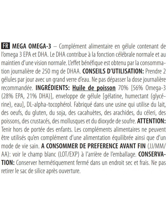 Mega omega 3 (90 capsules) bevat 70% EPA (eicosapentaeenzuur) en DHA (docosahexaeenzuur) vetzuren, die het zenuwstelsel en het cardiovasculaire systeem helpen beschermen. DHA helpt ook om een normaal gezichtsvermogen te behouden.