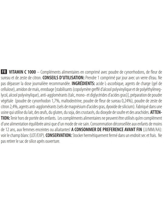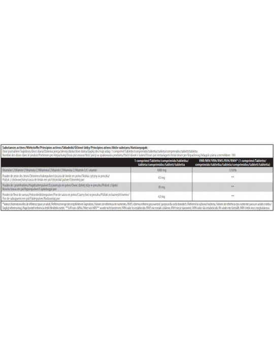 [stabilisants (copolymère greffé d’alcool polyvinylique et de polyéthylèneglycol, alcool polyvinylique), anti-agglomérants (talc, mono- et diglycérides d’acides gras)]Ingrediënten: L-ascorbinezuur, vulstoffen (cellulosegel), maïszetmeel, coating, plantaardige poederbereiding (rozenbottelpoeder 1,7%, maltodextrine, vlierbloesempoeder 0,24%), citroenschilpoeder 2,4%, antiklontermiddelen (magnesiumzouten van vetzuren, siliciumdioxide).