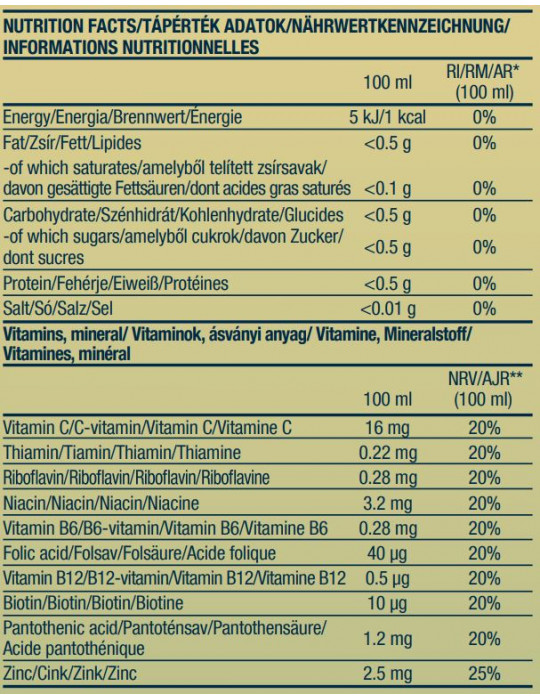 Ingrediënten Citroen: water 99%, Vitamineral Mix (L-ascorbinezuur, thiamine hydrochloride, riboflavine, nicotinamide, pteroylmonoglutaminezuur, D-calciumpantothenaat, pyridoxine hydrochloride, D-biotine, cianocobalamine, zinksulfaat), zuurteregelaar (citroenzuur), stabilisatoren (Arabische gom of acacia, glycerolesters van houthars), geconcentreerd sap (appel, citroen), bladconcentraat van saffloer, aroma, zoetstof (sucralose), kleurstof (groene S).
