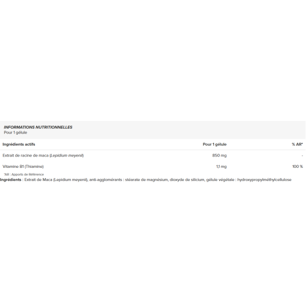Ingrediënten: Maca-extract (Lepidium meyenii), antiklontermiddelen: magnesiumstearaat, siliciumdioxide, vegetarische capsule: hydroxypropylmethylcellulose