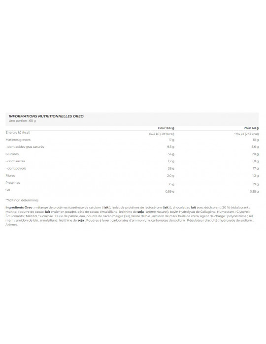 Oreo ingrediënten eiwitmengsel (calciumcaseïnaat ( melk ), wei-eiwitisolaat (melk), chocolade met melk met zoetstof (20%) (zoetstof: maltitol; cacaoboter, melk vol cacaopoeder, cacaomassa, emulgator: cacaolecithine soja ;natuurlijk aroma), rundercollageenhydrolysaat, bevochtigingsmiddel: glycerol; zoetstoffen: Maltitol, Sucralose ; Palmolie, water, magere cacaopoeder (3%), tarwebloem , maïszetmeel, koolzaadolie, vulstof: polydextrose ; zeezout, tarwezetmeel , emulgator: tarwe lecithine soja ; rijsmiddelen: ammoniumcarbonaten, natriumcarbonaten; Zuurteregelaar: natriumhydroxide; Aroma's.