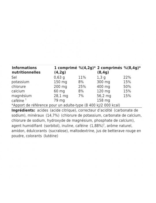 Roze pompelmoes ingrediënten: Zuurvormer (citroenzuur), zuurteregelaar (natriumcarbonaat), kaliumchloride, bevochtigingsmiddel (sorbitol), inuline, calciumcarbonaat, natriumchloride (CH: zout), cafeïne (75 mg/tablet), magnesiumhydroxide, natuurlijk aroma, tricalciumfosfaat, zetmeel, zoetstof (sucralose), maltodextrine, rode bietensappoeder, kleurstof (luteïne).