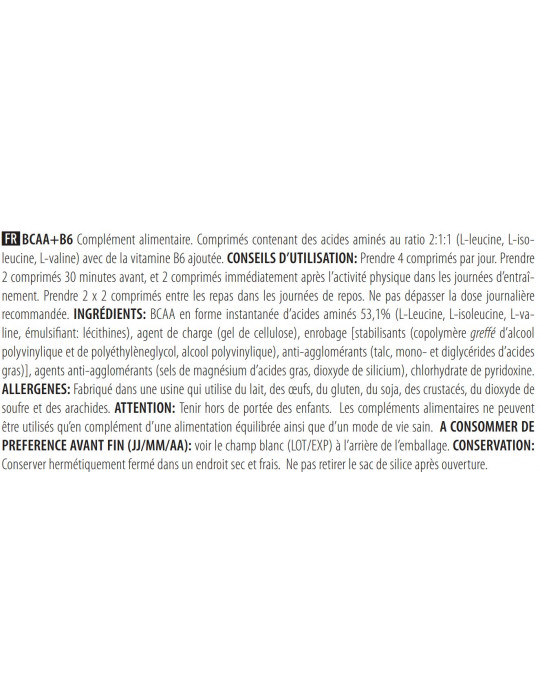 Ingrediënten : [stabilisants (copolymère greffé d'alcool polyvinylique et de polyéthylèneglycol, alcool polyvinylique), anti-agglomérants (talc, mono- et diglycérides d'acides gras)] Instant BCAA 53,1% (L-leucine, L-isoleucine, L-valine, emulgator: 0), vulstof (cellulosegel), coating , antiklontermiddelen (magnesiumzouten van vetzuren, siliciumdioxide), pyridoxine hydrochloride.