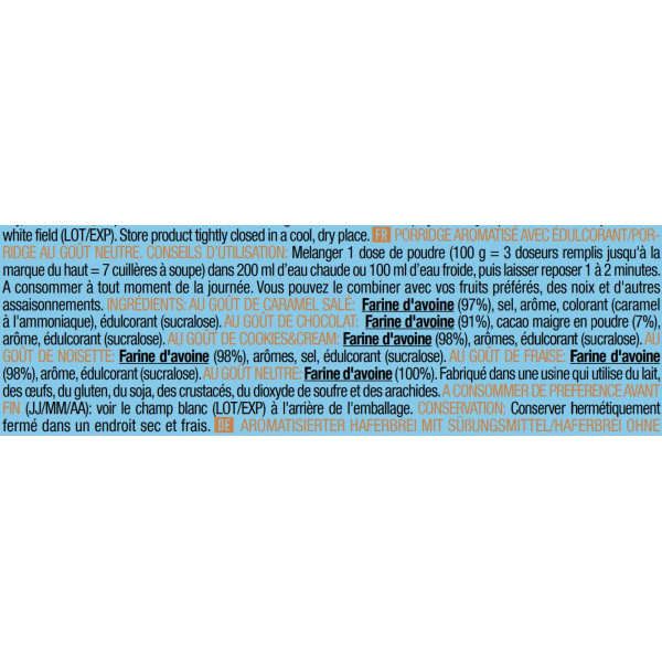 Ingredienten Hazelnoot :Havermeel (98%), aroma, zoetstof (sucralose).Ingredienten Neutraal: Havermeel (100%).