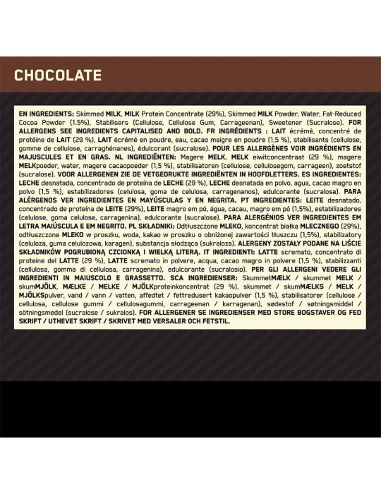 Ingrediënten Chocolade: Magere melk (80%), water, melkeiwitconcentraat (5,4%), ontvette cacaopoeder (1%), zuurteregelaar (trinatriumcitraat), aroma, stabilisator (gellangom, carrageen), zoetstof (sucralose).