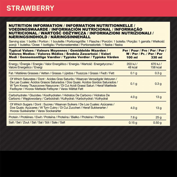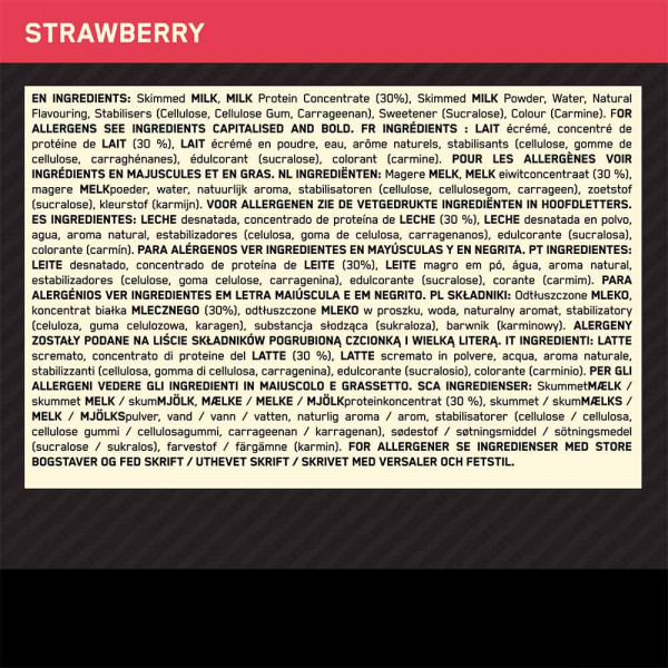 Ingrediënten Aardbei : Magere melk (80%), water, melkeiwitconcentraat (5,8%), aroma, stabilisatoren (gellangom, carrageen), zuurteregelaar (trinatriumcitraat), kleurstof (lycopeen), zoetstof (sucralose).