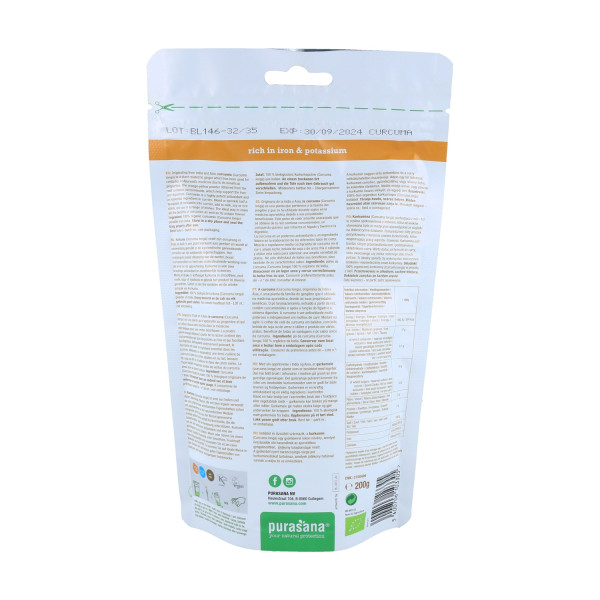 Nettogewicht : 200 gMeng ½ theelepel Purasana Kurkuma in 300 ml plantaardige melk, vruchtensap of smoothie. Gebruik in verschillende gerechten.