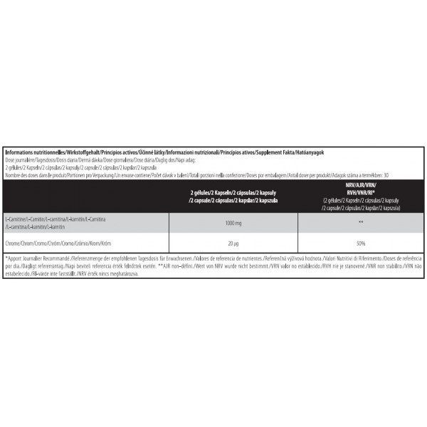 [gélatine, agent d'enrobage (shellac), colorant (oxydes de fer et hydroxydes de fer), régulateur d'acidité (hydroxyde d'ammonium), régulateur d'acidité (hydroxyde de potassium)]Ingrediënten: L-Carnitine L-tartraat 85%, capsulehuls, antiklontermiddel (magnesiumzouten van vetzuren), chroom(III)chloride 0,006%.