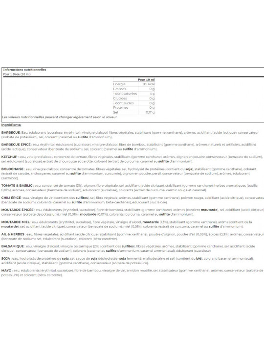 SPICY BARBECUE: water, erytritol, zoetstof (sucralose), alcoholazijn, bamboevezel, stabilisator (xanthaangom), natuurlijke en kunstmatige aroma's, zuurteregelaar (melkzuur), conserveermiddel (natriumbenzoaat), zout, kleurstof ( ammoniumsulfietkaramel ).