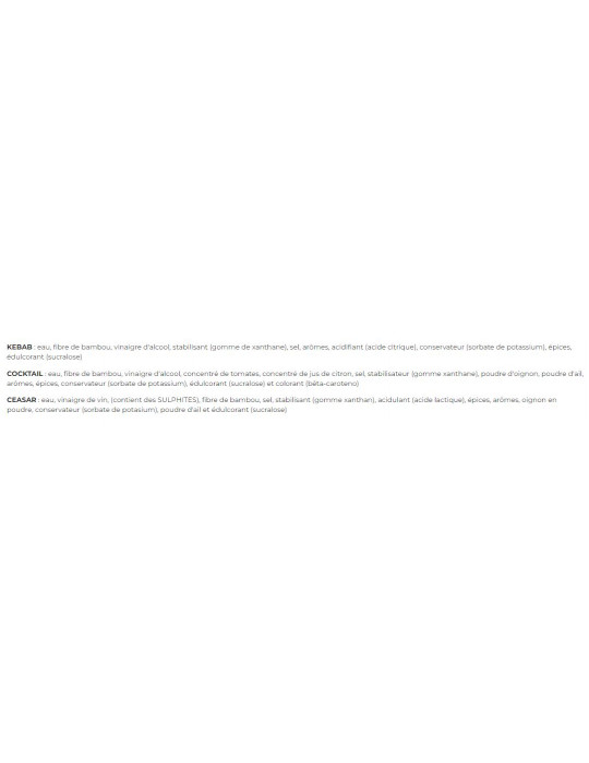 COCKTAIL: water, bamboevezel, alcoholazijn, tomatenconcentraat, citroensapconcentraat, zout, stabilisator (xanthaangom), uipoeder, knoflookpoeder, aroma's, kruiden, conserveermiddel (kaliumsorbaat), zoetstof (sucralose) en kleurstof (bètacaroteen)