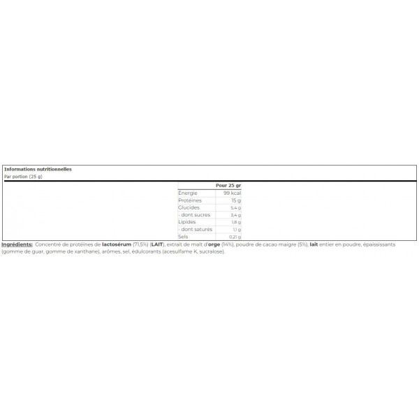Ingrediënten: Wei-eiwitconcentraat (71,5%)(MELK),gerstemoutextract (14%), magere cacaopoeder (5%), volle melkpoeder, verdikkingsmiddelen (guarpitmeel, xanthaangom), aroma's, zout, zoetstoffen (acesulfaam K, sucralose).