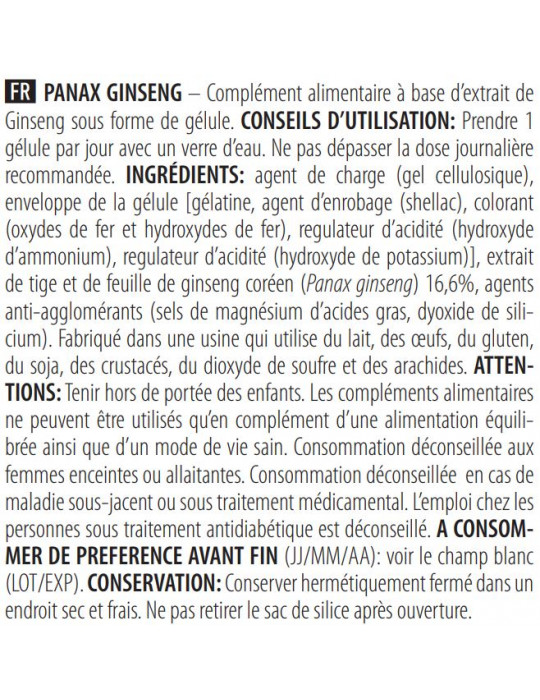 [gélatine, agent d’enrobage (shellac), colorant (oxydes de fer et hydroxydes de fer), régulateur d’acidité (hydroxyde d’ammonium), régulateur d’acidité (hydroxyde de potassium)]Ingrediënten: vulstof (cellulosegel), capsulehuls, Koreaanse ginseng (Panax ginseng) stam- en bladextract 16,6%, antiklontermiddelen (magnesiumzouten van vetzuren, siliciumdioxide).