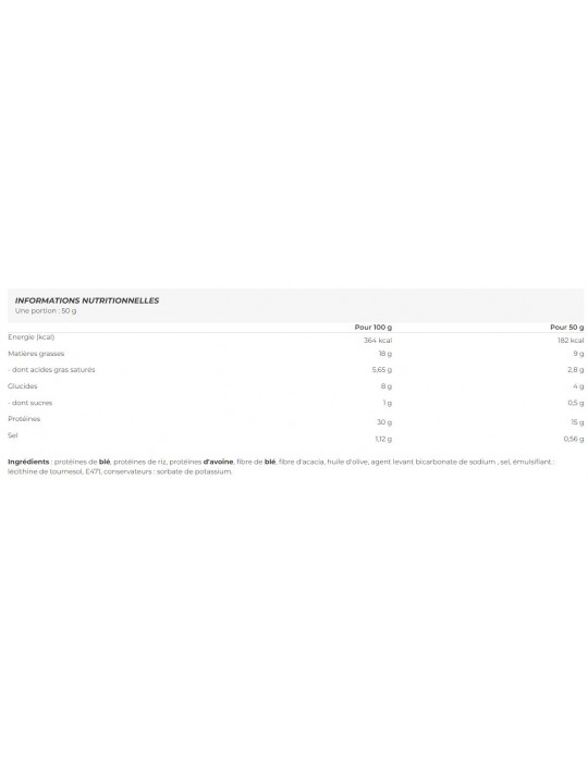 Ingrediënten : tarwe-eiwit, rijsteiwit, haver-eiwit, tarwevezels, acaciavezels, olijfolie, rijsmiddel natriumbicarbonaat, zout, emulgator: zonnebloemlecithine, E471, conserveermiddel: kaliumsorbaat.
